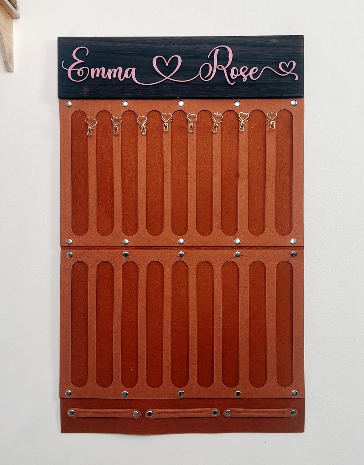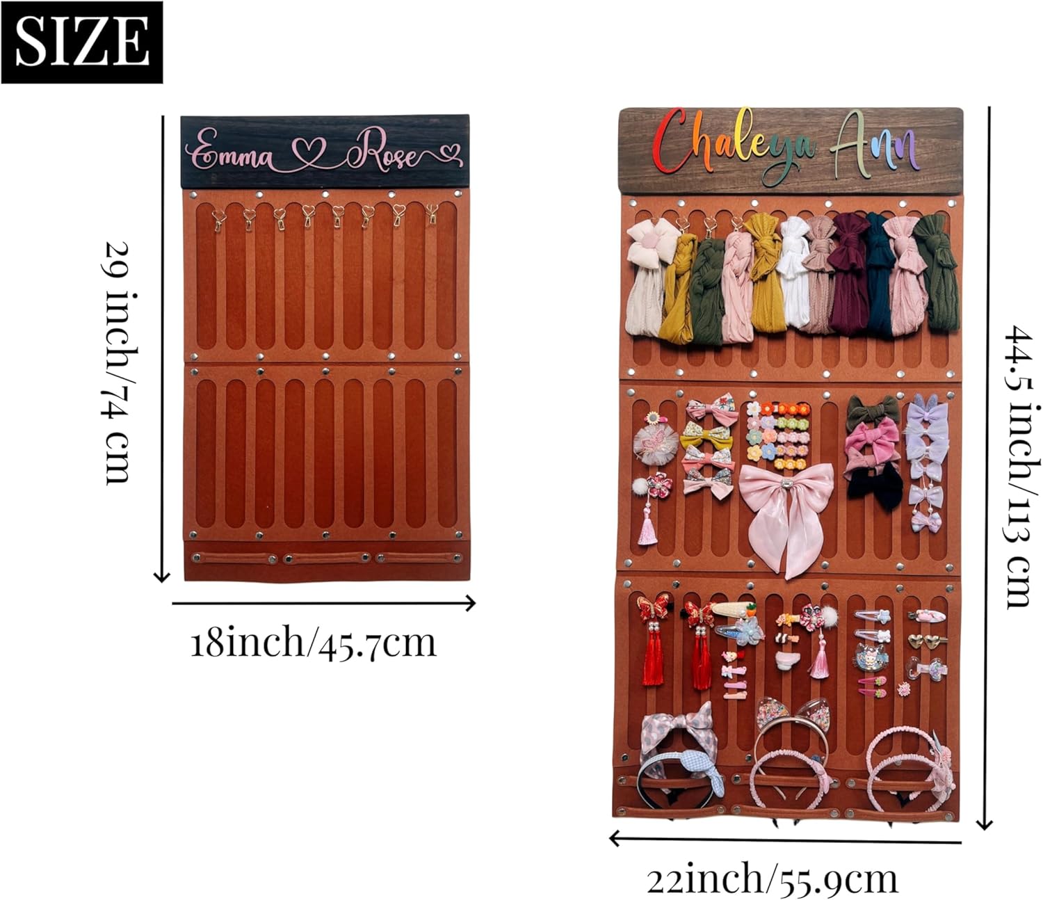 You can hang a family's hair accessories on it, including mom and daughter hair bows, headbands, clips, and even other small items for the baby. It can organize a lot of things and has a large capacity. The thick wool felted Cloth can be disassembled, washed and folded. There are two colors of felted Cloth, namely white and camel. I will match the felted Cloth according to the color of the wood board you choose. Normally, cool-colored wood boards will be matched with camel-colored Cloth, and warm-colored wood boards will be matched with white Cloth. For a better look, the corners of the 18" board are at right angles and the corners of the 22" board are rounded.